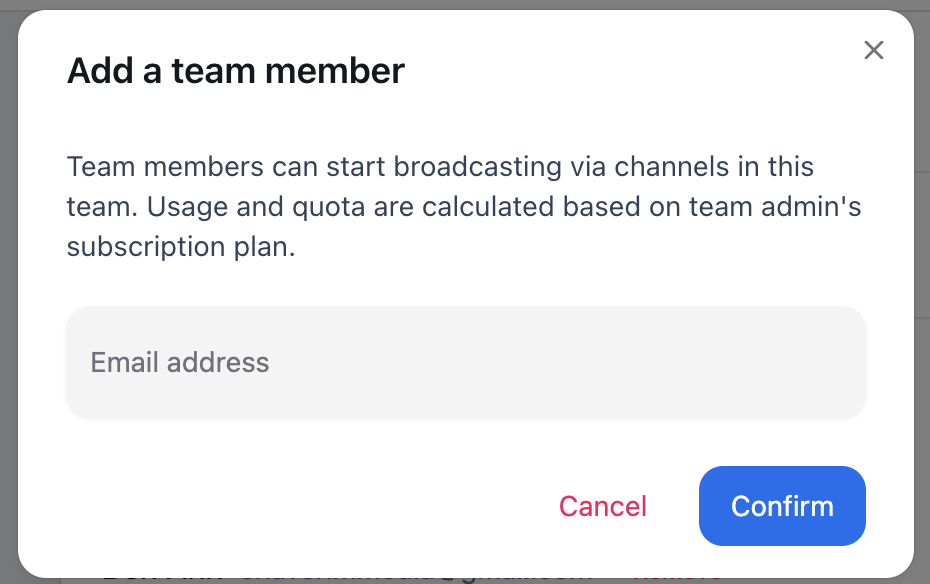 Sie können andere zu Ihrem Teamkanal hinzufügen, damit sie mit den Kanälen und dem Kontingent des Teams übertragen können. Stellen Sie sicher, dass sie bereits ein Hope-Übersetzer-Konto haben—wenn nicht, lassen Sie sie ein kostenloses Konto anlegen und es erneut versuchen. Wenn Sie ein Team erstellen, wird ein neuer Kanal für dieses Team angelegt; Teammitglieder hinzuzufügen ist auch die Art, neue Kanäle zu erstellen und Zugang zu teilen.