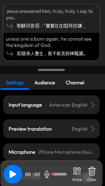 Sie können eine Live-Übertragung auch direkt über die Hope-Übersetzer-App hosten, verfügbar für iOS und Android. Sie brauchen nur Ihr Handy—ohne zusätzliche Ausrüstung. Moderne iPhone- und iPad-Mikrofone liefern heute in den meisten Live-Übersetzungsszenarien bereits eine sehr gute Sprachqualität. Für noch klareres Audio (besonders draußen oder in lauter Umgebung) können Sie ein Funkmikrofon anschließen, damit Ihre Stimme für alle, die zuhören oder mitlesen, klar bleibt. So lassen sich Außengottesdienste, Kleingruppen oder Kurse einfach durchführen, bei denen Menschen per QR-Code-Scan oder Link auf dem eigenen Gerät beitreten. Eine Schritt-für-Schritt-Anleitung finden Sie unter Live-Übertragung aus der mobilen App.