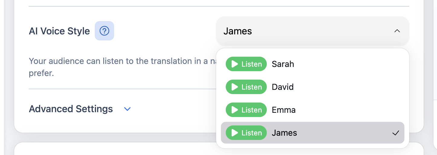 KI-Stimmenstil: Ihr Publikum kann die Übersetzung in einer natürlichen, lebensechten KI-Stimme hören. Sie können je nach Anlass eine männliche oder weibliche Stimme wählen. Klicken Sie neben jeder Option auf Anhören, um vor der Auswahl zu hören, wie sie klingen.