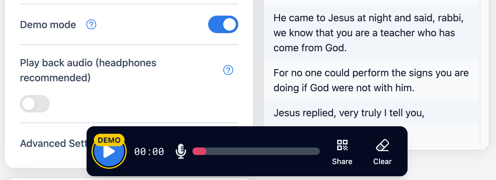 Starting a demo broadcast is simple: enable demo mode, press play, check the preview and output language, click share, and have others scan the QR code from their phone. No account or microphone is needed to try it. When you’re ready for a real session, switch off demo mode and follow our guides for web or mobile broadcast.