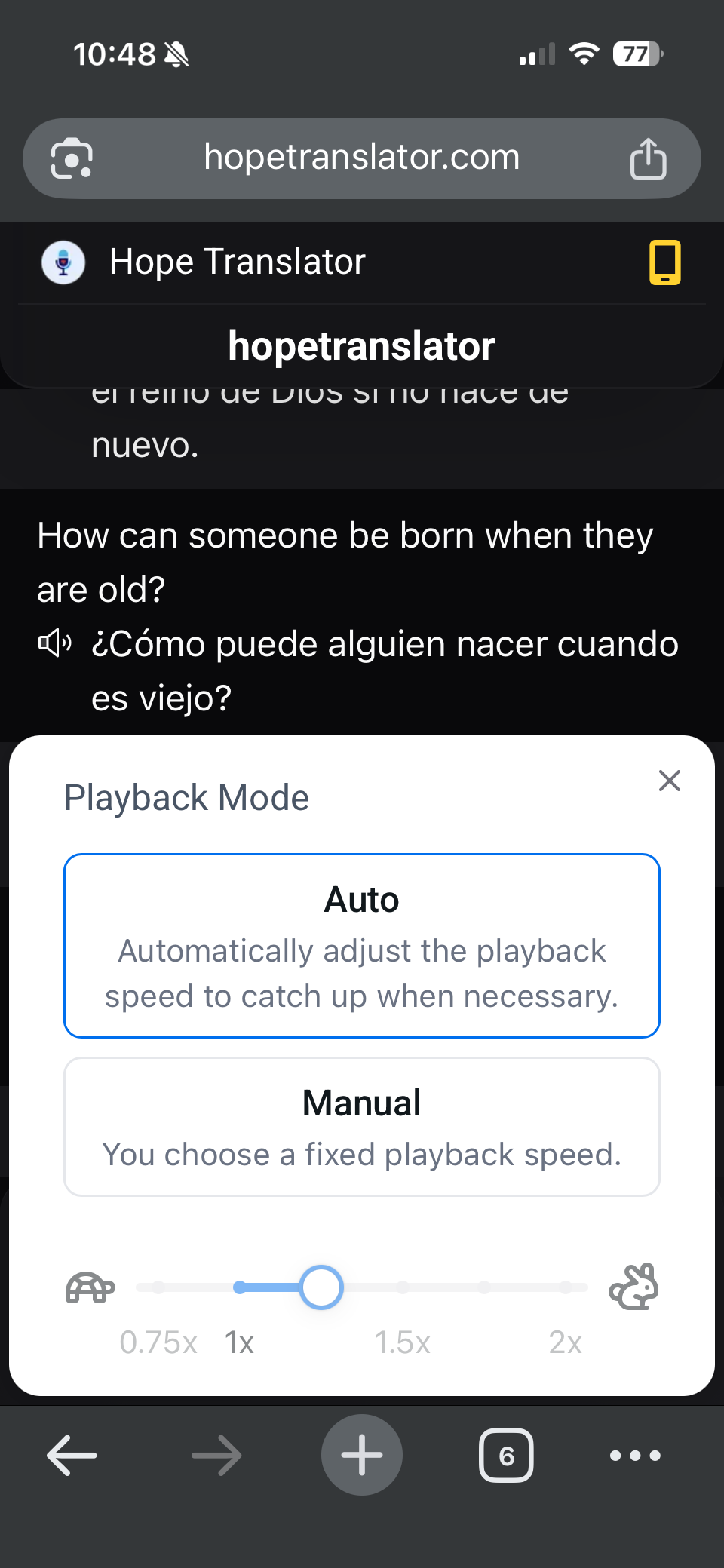 Auto Mode: Automatically adjusts the playback speed based on the incoming translation rate. This mode ensures smooth, natural-sounding audio by matching the pace of the live translation feed.