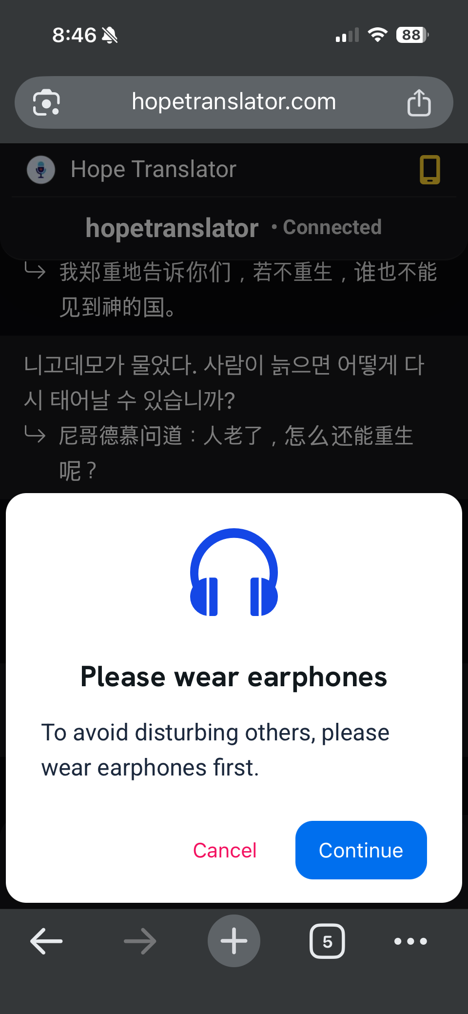 With Hope Translator's live audio translation feature, your audience can listen to translations in their preferred language in real-time: